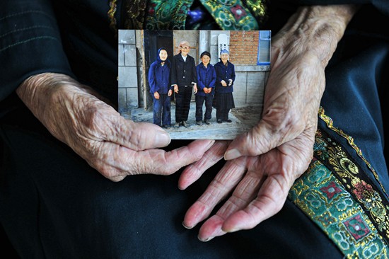 2020年9月25日,内蒙古根河市,玛利亚·索手中展示着1987年春天她与猎民朋友在敖鲁古雅鄂温克民族乡政府(旧址)门口的合影。那年她66岁,家中有300余头驯鹿,每年春季锯下来的鹿茸需要集中到民族乡供销社进行销售。