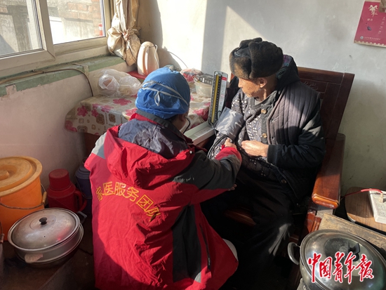 1月5日,北京市房山区河北中心卫生院的家庭医生先必忠在为当地村民王友量血压。王友72岁,和老伴住在山坡上,孩子在北京市城区打工。当天,先必忠上门随访,并带来一些退烧、感冒的药。中青报·中青网记者 刘昶荣/摄
