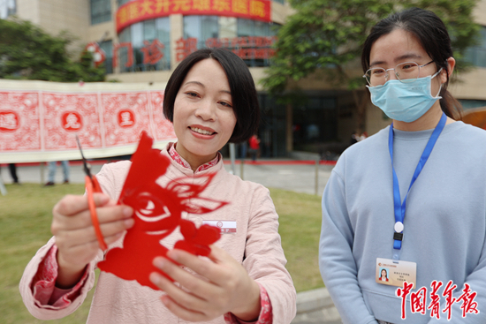 1月14日,广西工艺美术大师、南宁市非物质文化遗产剪纸代表性传承人钟昀睿(左)现场创作兔年新春主题的剪纸作品送给市民群众。在兔年春节即将来临之际,广西南宁市文联、美协、书法家协会等单位共同举办“我们的中国梦——文化进万家”迎新春惠民活动,艺术家来到广西医大开元埌东医院前广场,现场书写春联、绘制年画、创作兔年剪纸,给市民送去新春祝福。中青报·中青网记者 谢洋/摄