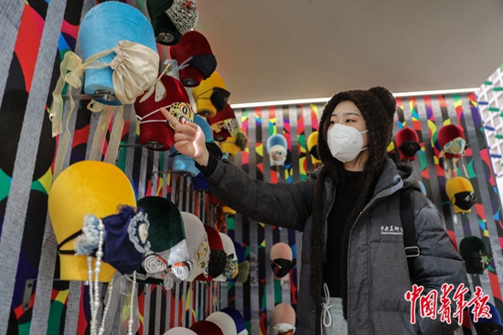 1月17日,中国工艺美术馆·中国非物质文化遗产馆,一名参观者在“文化之美·绣色可观”展览的粤绣口罩创新展示区观展。春节假期即将到来,不少市民前来参观打卡,感受非遗文化中的年味儿。中青报·中青网记者 孔斯琪/摄