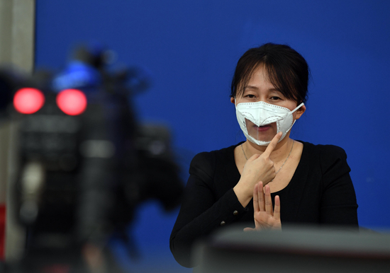 2020年2月4日,北京市举行新型冠状病毒感染的肺炎疫情防控工作新闻发布会。发布会首次增加手语翻译。 毛建军(摄影部)/中新社/人民视觉