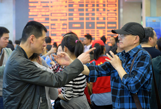 一次招聘会的现场,两名聋哑人职者在招聘会现场用手语进行交流。视觉中国供图(资料图片)