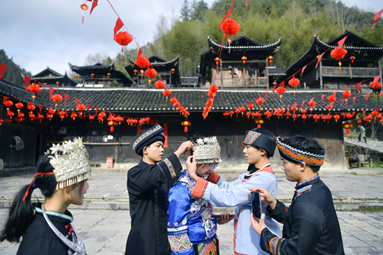 1月18日,在湖北省宣恩县沙道沟镇彭家寨吊脚楼前,游客换上土家族传统服饰游玩。春节将至,各地张灯结彩,洋溢着祥和的年味。宋文/摄(新华社发)