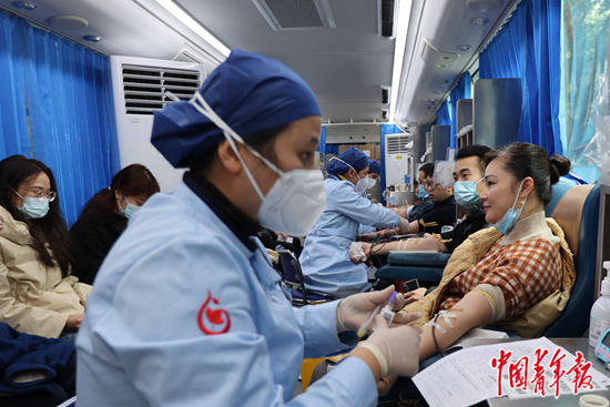 1月17日,团广西区委干部职工和周边企事业单位团员青年在流动采血车上献血。当天,针对各地血液库存紧张和偏远地区、农村地区部分群众出现缺药少医等困难问题,团广西区委联合广西区直机关工委、南宁中心血站等单位,组织200余名团员青年开展首场“献血我带头 青年在行动”暨春节返乡“我为老乡带盒药”志愿服务活动。 中青报·中青网记者 谢洋/摄