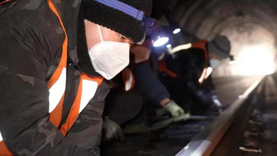 9点30分,调度命令下达,白琳带领青工们进入隧道开始今天的“天窗”点施工作业。隧道内一片漆黑,即使戴上头灯,能见度最多也只有10米,青工们身穿厚衣,头戴棉帽,利用好每一分每一秒,对线路设备进行维修养护,保障春运运输安全。他们有的弯腰用道尺检查线路几何尺寸,有的趴在钢轨上侧身检查钢轨的水平、高低,还有的用捣固机“突突突”地整修线路。