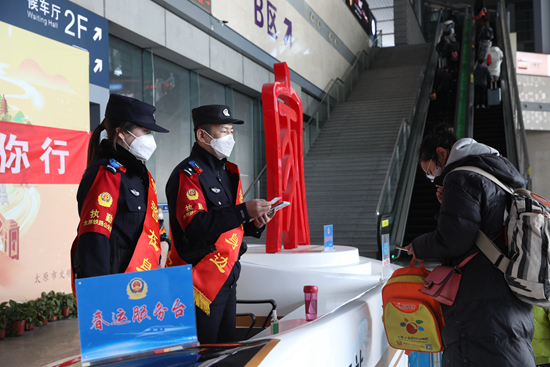春运期间,太原铁路公安处团委组织青年民警为旅客提供周到服务,让旅客有更好的出行体验。图为民警在发放反诈宣传资料。王龙/摄