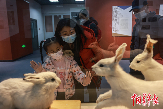 1月18日,北京自然博物馆,“大展宏‘兔’——癸卯(兔年)新春生肖文物图片联展”上,观众在参观兔子标本。兔年来临之际,不少家长带着孩子参观这场以兔为主题的展览,了解关于兔的物种知识与文化寓意。中青报·中青网记者 曲俊燕/摄