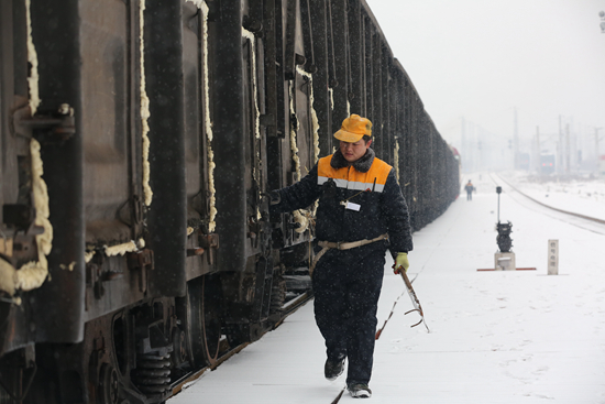1月15日,中国铁路郑州局集团有限公司焦作车务段月山运转车间连结员白二洋在对满载电煤的列车进行解体作业。宋京/摄