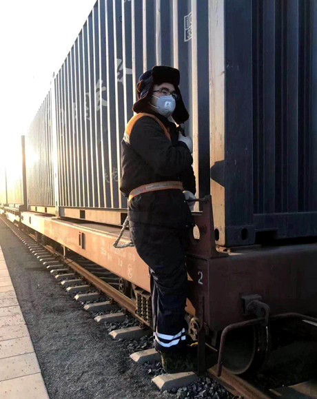 秦皇岛车务段龙家营站连接员王光杰在调车作业中瞭望线路情况,确保中欧班列快速发运。杨路/摄