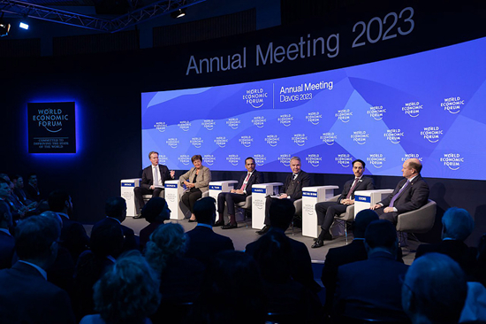 1月17日,瑞士达沃斯,世界经济论坛年会上,(从左起)世界经济论坛主席布伦德、国际货币基金组织总裁格奥尔基耶娃、卡塔尔外交大臣穆罕默德、芬兰外交部长哈维斯托、沙特外交大臣费萨尔和美国民主党参议员克里斯·考恩斯出席一个小组会议。视觉中国供图