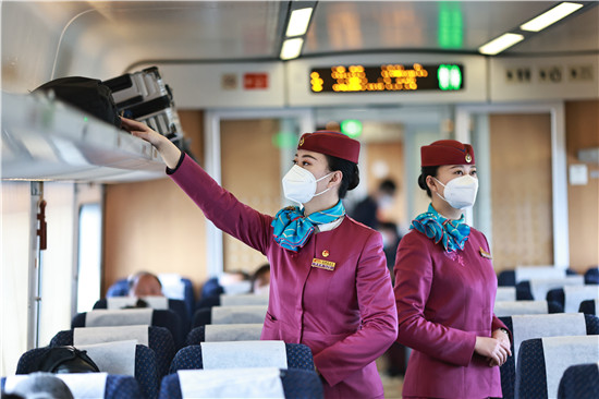 1月30日,重庆,范爱霖和范爱霓一起巡视车厢。在中国铁路成都局集团有限公司成都客运段城际动车二队值乘的C6104次列车(重庆北—石柱县)上,有一对95后双胞胎姐妹乘务员——姐姐范爱霖和妹妹范爱霓。2014年,她们同时进入成都客运段,共同度过了10个春运。苏志刚/摄