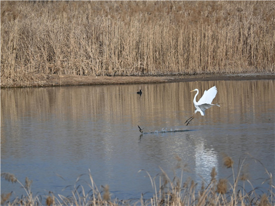 冬天,河道中芦苇和灌丛铺展开苍黄的色调,相对僻静的河段还能看到白鹭低飞,水鸭凫冰。