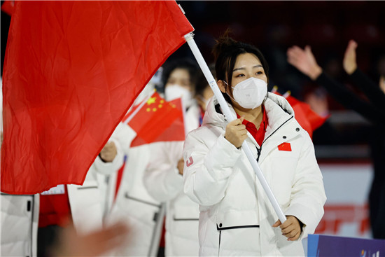 当地时间1月12日,韩雨作为中国大学生体育代表团旗手在第31届世界大学生冬季运动会开幕式上。图片来源:国际大学生体育联合会官方网站