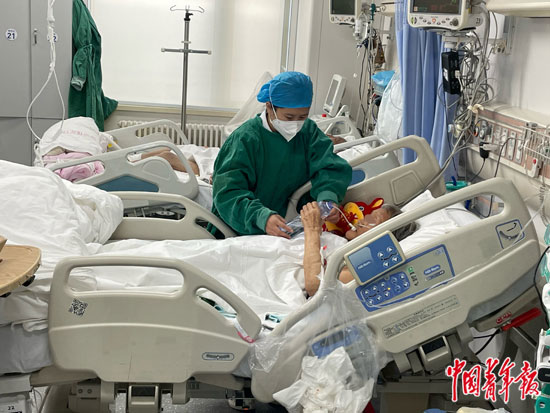 呼吸与危重症医学科重症病房里,护士陈文燕正在喂患者喝水。患者旁边的兔子吉祥物是医院安宁疗护小组送来的春节礼物。