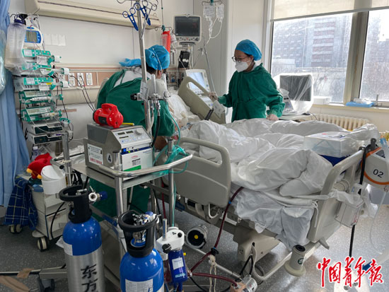 呼吸与危重症医学科重症病房里,一位患者即将去做CT检查,两位医护人员正在做相关准备。这位63岁的患者因感染新冠病毒导致病情危重,当天还在使用体外膜肺氧合(ECMO)。经过医院积极治疗,患者的病情已开始好转,记者拍摄当天,患者意识清醒,可以使用手机。