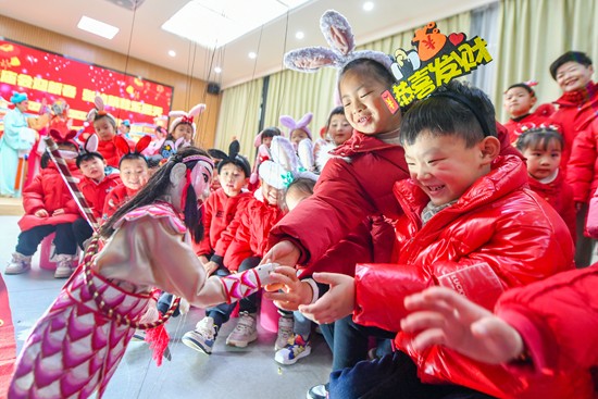 2月6日,浙江省湖州市长兴县张家村花园幼儿园,孩子们与提线木偶互动。当日,全国多地迎来2023年春季学期开学。谭云俸/摄(新华社发)
