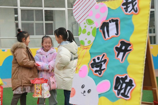 2月6日,在山东省高密市农丰幼儿园,小朋友相聚在校园里兴高采烈。当日,全国多地迎来2023年春季学期开学。李海涛/摄(新华社发)