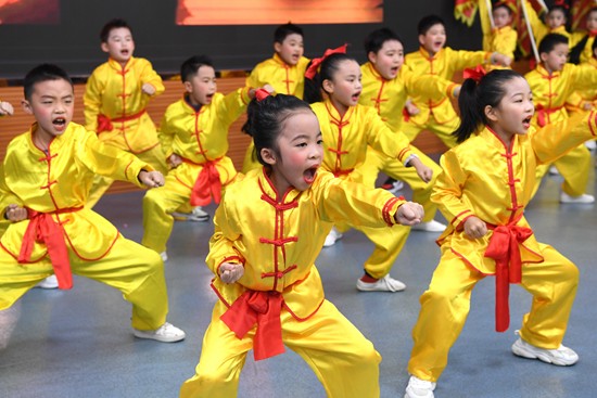 2月6日,学生在广西南宁市滨湖路小学教育集团滨湖校区开学仪式上表演武术。当日,全国多地迎来2023年春季学期开学。新华社记者 周华/摄