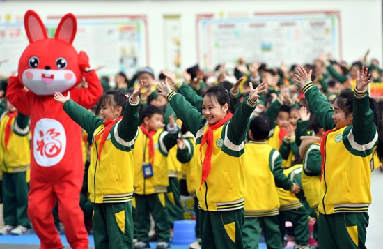 2月6日,在四川省南充市蓬安县实验小学开学典礼上,学生跳起兔子舞喜迎新学期。当日,全国多地迎来2023年春季学期开学。刘永红/摄(新华社发)