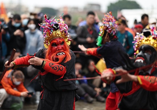 2月6日,农历正月十六,福建省莆田市涵江区白塘镇洋尾村,农民们头插五色纸丝花,头戴各式狰狞獠牙面具,足蹬草鞋,手执竹仗跳起皂隶舞。据悉,皂隶舞由西汉的“傩舞”演变而来,属于我国古代驱邪除妖的民间舞蹈,在莆田已有600多年的历史。正月里“闹元宵”是莆田的一张独特的文化名片,从每年的正月初三一直到二月初二,每天都会有极具传统文化特色的节目在莆田各地上演。刘占崑/摄