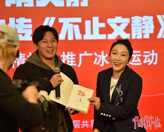 2月5日,北京图书大厦,隋文静(右)将新书《不止文静》的001号赠与搭档韩聪。中青报·中青网记者 慈鑫/摄