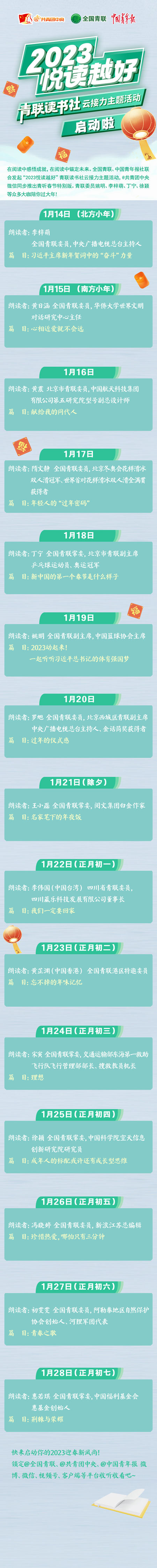 从1月14日(北方小年)至1月28日(正月初七),全国青联秘书处、中国青年报社联合发起“2023悦读越好”青联读书社云接力主题活动。姚明、丁宁、李梓萌等15位青联委员,带领青年回顾年味记忆,在阅读中感悟成就,在阅读中锚定未来。