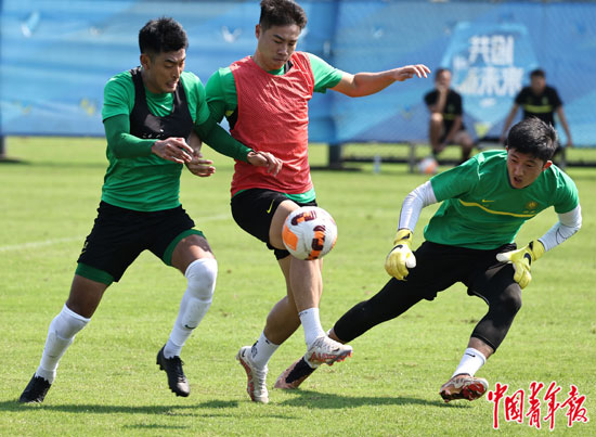 2月12日,在海南省海口观澜湖国际足球训练基地进行冬季集训的北京国安足球队进行了一场队内教学赛,以检验过去3天的训练成果。图为国安队王子铭(左) 、杨帆(中) 和守门员邹德海(右)争夺。2023赛季中超联赛将回归主客场制,北京“新工体”将作为国安队主场。刘占崑/摄