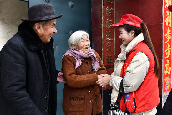 2月12日,在山东省郓城县郓州街道王沙湾村,沈宜明和魏金兰(中)在门口迎接郓城县居家养老服务中心工作人员祝秀花。