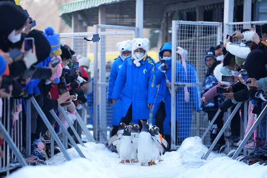 2月12日,哈尔滨极地公园的企鹅外出“巡游”。