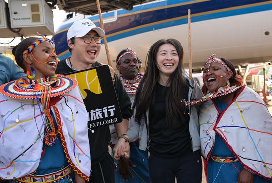 2月11日,在肯尼亚首都内罗毕乔莫·肯雅塔国际机场,中国游客和肯尼亚演员互动。