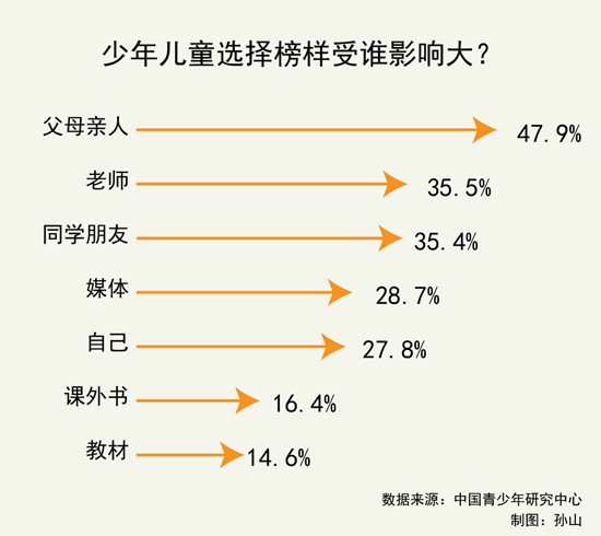 榜样是少年儿童学习模仿的重要对象。在选择榜样时,少年儿童受谁的影响更大?中国青少年研究中心进行的“少年儿童偶像与榜样研究报告”显示,受访少年儿童选择榜样受父母亲人影响最大。在不同学段的少年儿童中,小学生对榜样的选择受身边师长及教材、课外书等传统读物的影响更大。