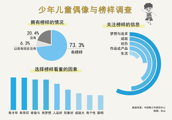 对少年儿童关注榜样的信息研究发现,少年儿童最关注榜样的梦想与追求(58.8%),排在第一位,其次是成就(47.0%),接下来依次是经历(39.0%)、作品或产品(24.8%)和生活(15.5%)。可见,少年儿童学习榜样更看重他们的内在品质与精神。