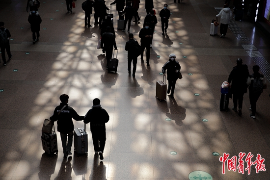 2月10日,北京西站,旅客在长廊穿梭,准备进入各自的候车大厅。据了解,2023年春运期间(1月7日至2月15日),全国铁路累计发送旅客3.48亿人次,日均发送870万人次,恢复至2019年的85.5%,其中有11天单日旅客发送量超千万人次,铁路客流实现大幅回升。中青报·中青网记者 陈剑/摄