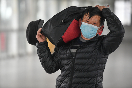 2月6日,安徽阜阳火车站,一名扛着包裹的旅客准备乘车。阜阳是全国五大劳务输出地之一,每年春节过后,这里都有数百万人踏上进城务工之路。视觉中国供图