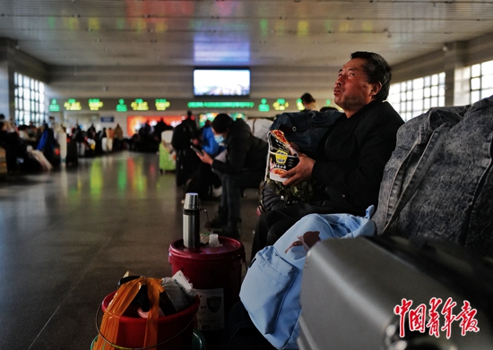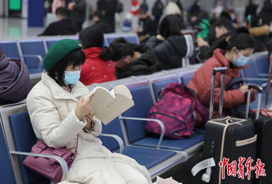 1月25日,重庆北站候车大厅,一名旅客在候车间隙看书。中青报·中青网记者 陈剑/摄