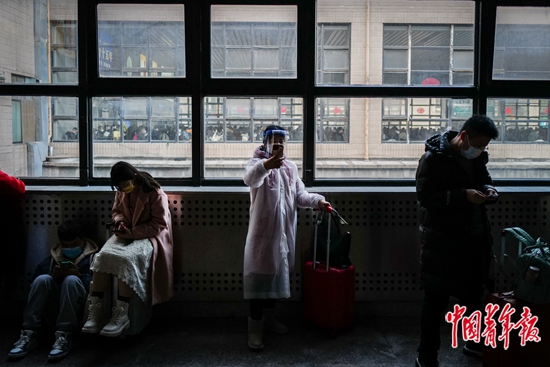 1月18日,北京西站,一名穿着雨衣、戴着防护面罩的候车旅客在自拍。中青报·中青网记者 赵迪/摄