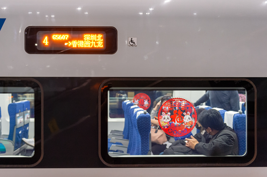 1月15日,深圳北站,G5607次高铁列车上的乘客。这是因疫情停运后首趟从深圳北站开往香港西九龙站方向的高铁列车。当日,因疫情停运近3年的广深港高铁香港段恢复运营,粤港两地铁路客运业务重启。视觉中国供图