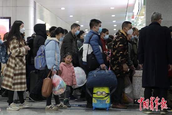 1月25日,重庆北站候车大厅,旅客排队检票。一个小朋友戴的眼镜和身旁旅行箱上“小黄人”的大眼睛相映成趣。据中国铁路消息,今年春运截至2月7日,重庆在热门出发城市和热门到达城市中均位列前十。中青报·中青网记者 陈剑/摄