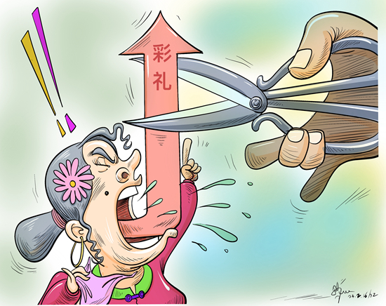 甘肃定西日前公布了治理高价彩礼行动方案的实施情况。去年5月,当地出台的相关行动方案明确,婚嫁礼金不超过5万元,城区和农村举办婚事酒席均不超过20桌等。消息称,据不完全统计,自2022年6月行动方案启动实施以来,定西70%的出嫁方彩礼控制在0至5万元以内,平均为4.9万元。(澎湃新闻 2月13日)漫画:徐简