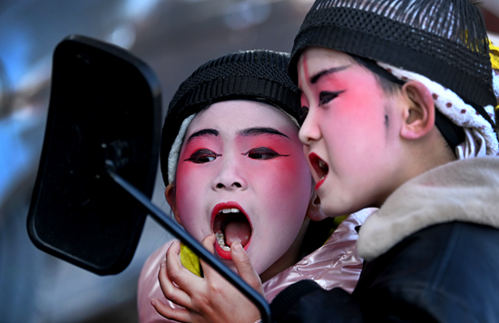 2月19日,西安市临潼区栎阳街道卷子村参加“背芯子”表演的两名小朋友查看自己的化妆效果。