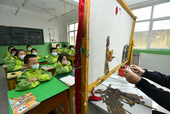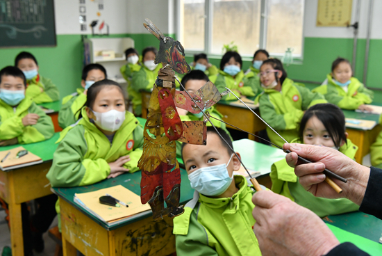 2月17日,张维宗(左一)在河北省沧州市献县段村镇中心小学教授学生皮影戏表演技巧。