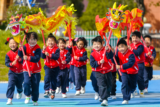 2月21日,浙江省湖州市长兴县夹浦镇中心幼儿园的孩子们体验舞龙。当日是农历二月初二,是我国民间俗称“龙抬头”的日子,人们在丰富多彩的民俗活动中欢庆传统节日。谭云俸/摄(新华社发)