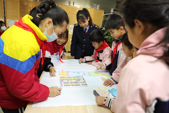 2月9日,广西百色市田阳区税务局青年干部到田阳区第七小学开展以“税润童心 逐梦未来”为主题的“开学税宣第一课”活动,运用通俗易懂的方式向小学生宣传税法知识。图为税务干部与小朋友们一起画出自己“心中的税收”,一笔一划勾勒出童心里的祖国税收。邢政/摄