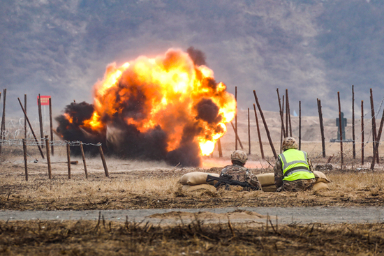 随着时间的流逝,廖奇云额头上的汗水越来越多,“敌”堡映入眼帘。突然,廖奇云猛地跃起,拉开手榴弹拉环,快速扔向地堡火力口,并就近躲避。“轰!”随着一声爆炸声响起,“敌”地堡被成功摧毁。虽然浑身灰土,但廖奇云却意犹未尽:“以前投弹就‘听个响’,现在难度和危险系数增大,但更贴近实战,训练成绩‘含战量’更高。”