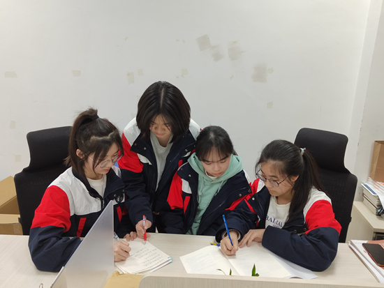 重庆市西南大学附属中学学生游梦洁、杨雅婷、郑雯黎、江怡行在讨论模拟政协提案。受访者供图