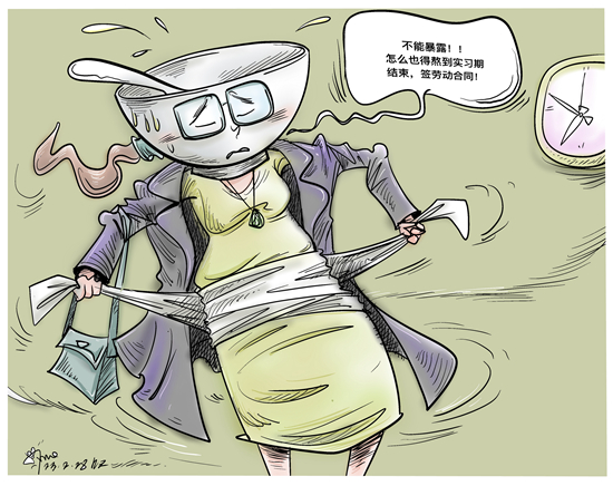 当下,“隐孕”已成为女性的一种不得已的职场生存策略。担心被降薪、辞退、影响试用期转正、升职加薪等,是很多职场女性选择“隐孕”的重要原因。在“隐孕”的另一端,是一些企业对于孕产期女职工可能带来的额外用工成本的担心。专家建议,应建立合理的生育成本分担机制,打造生育友好型职场环境。(《工人日报》2月27日)漫画:徐简