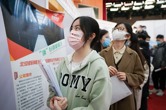 3月1日,在北京信息科技大学,求职学生在招聘会内求职。