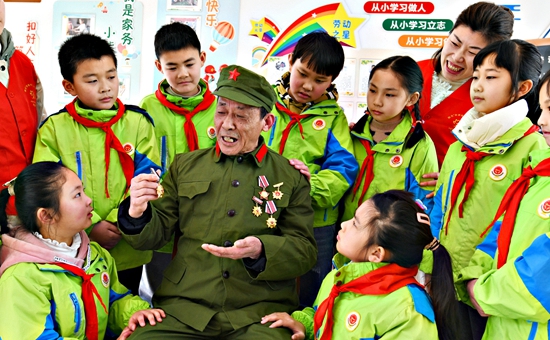 3月2日下午,安徽省安庆市迎江区荷花塘社区党委将红色讲台搬到校园,邀请退役老兵走进辖区四照园小学,向学生讲述雷锋的故事,弘扬雷锋精神,为孩子们上了一堂别开生面的红色教育课。黄有安/视觉中国