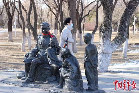 抚顺雷锋纪念馆园区,行人从雷锋雕像旁走过。郭玉洁/摄