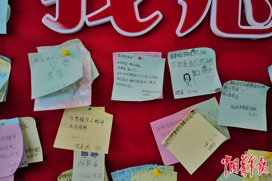 3月1日上午,辽宁省抚顺市,雷锋纪念馆内参观者留言便利贴。赵迪/摄
